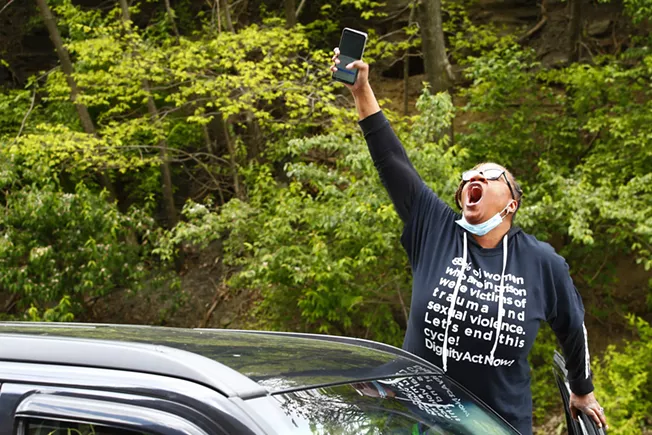 The protest began in the parking lot of the former Shop 'n Save in the Hill District, before the cars made their way to Downtown, stopping in front of Allegheny County Jail.